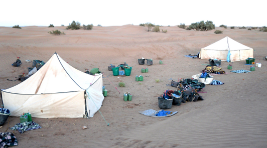 Wir treffen uns beim Frühstück, unsere Begleiter mit den Kamelen sind da. Wir bringen unsere Tagesrucksäcke und, pro Person, eine weitere Tasche zum Bepacken der Kamele. Unser restliches Gepäck bleibt im Hotel. Hamid, unser Guide, und seine Mannschaft packen routiniert. Wasser in 1,5-Liter-Flaschen, kleine Zelte für ein- oder zwei Personen, Gemeinschaftszelte, Kücheninventar und Lebensmittel. Mit allem werden die Kamele beladen, 14 oder 15 Tiere. Unglaublich, was sie tragen können. Dann starten wir, lassen die Zivilisation hinter uns, fließendes Wasser, Elektrizität, Häuser, Straßen, Wege, Verkehrsschilder, Werbung, Schaufenster, Behörden, Geschäfte. Wir wandern mit unseren Begleitern, mit den Kamelen, sind froh, dass wir nicht allein sind. Jetzt ist jeder wichtig. Nach einer guten Stunde gibt es eine Pause, dann geht es weiter. Die Sonne steigt höher, unsere Schatten werden kürzer, wir spüren die trockene Hitze. Die zweite Pause ist die Mittagspause. Die beiden Gemeinschaftszelte werden aufgestellt. Schatten! Schatten hat hier eine andere Bedeutung als in unserem gemäßigten Klima in Deutschland. Schatten ist lebensrettend. Schatten und Wasser sind lebensrettend. – Irgendwann brechen wir noch einmal auf, wandern wieder zweimal eine gute Stunde, dann sind wir am späteren Nachmittag in einer Umgebung, die für das Nachtlager wie geschaffen ist: sanfte Dünen, ein bisschen karge Vegetation, keinerlei Hinterlassenschaften von irgendetwas Lebendigem, was vor uns da gewesen sein könnte. Wir werden unseren Müll auch mitnehmen und das Terrain sauber verlassen. Die Kamele werden von ihren Lasten befreit. Sie bleiben in der Nähe des Lagers. Jede und jeder sucht sich einen Platz für sein Zelt oder sein Open-Air-Nachtquartier, entrollt Isomatte und Schlafsack, zieht sich um für die Nacht. Es wird kalt. Schon spürt man, dass die Sonne nicht mehr die Kraft hat wie zuvor. Später sind wir im Gemeinschaftszelt, essen, trinken Tee, nach und nach ziehen sich alle zurück, schlafen unterm Sternenhimmel oder im Zelt unter dem Sternenhimmel. Weißt du, wieviel Sternlein stehen?