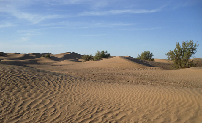 Tag zwei unserer Wanderung in der Sahara. Wir waren nach Marrakesch geflogen, hatten die unvergleichliche Stadt genossen und sind dann über das Atlasgebirge gefahren in den Süden Marokkos. Ein Stopp in Zagora, der letzten Stadt am Rande der Wüste. Wir besuchen den Markt, besorgen uns den Chèche, das lange Baumwolltuch, lernen es als Turban zu binden. Wir werden ihn brauchen bei unserer Wanderung durch die Wüste. Dann fahren wir weiter nach Süden, noch 90km durch das Draa-Tal, das jetzt kein Wasser mehr führt, zur Oase Mhamid, beziehen das Wüstenhotel Chez le Pacha für eine Nacht, wählen für diese erste Nacht in der Wüste die einfachste Zimmerkategorie, treffen uns zum Abendessen im Restaurant, bereiten dann unser Gepäck vor für die kommenden sechs Tage, legen uns zur Ruhe. Es ist still, unbeschreiblich still, so still, dass man sich vor dem Einschlafen schon fast fürchtet. Ich greife zu einem Büchlein mit irischen Gebeten, Segensworten, kurzen Besinnungen, denke an die Oma unserer Kinder, meine Schwiegermutter, die im Sterben liegt. Werde ich sie noch einmal sehen, wenn wir zurück sind? Schließlich schlafe ich doch ein. Es weckt mich der Esel, der laut schreit wie nur Esel schreien können, fast gleichzeitig ruft der Muezzin beim ersten Silberstreif am Horizont zum Gebet.